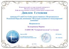 1 место в номинации «CV для получения должности в международной компании» было присуждено Марине Белогривцевой, группа Топ-1 (преподаватель Моисеева Е.А.);