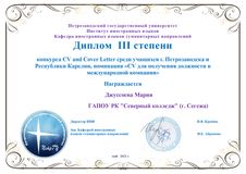 3 место в номинации «CV для получения должности в международной компании» заняла Мария Джуссоева, группа Топ-1 (преподаватель Моисеева Е.А.).